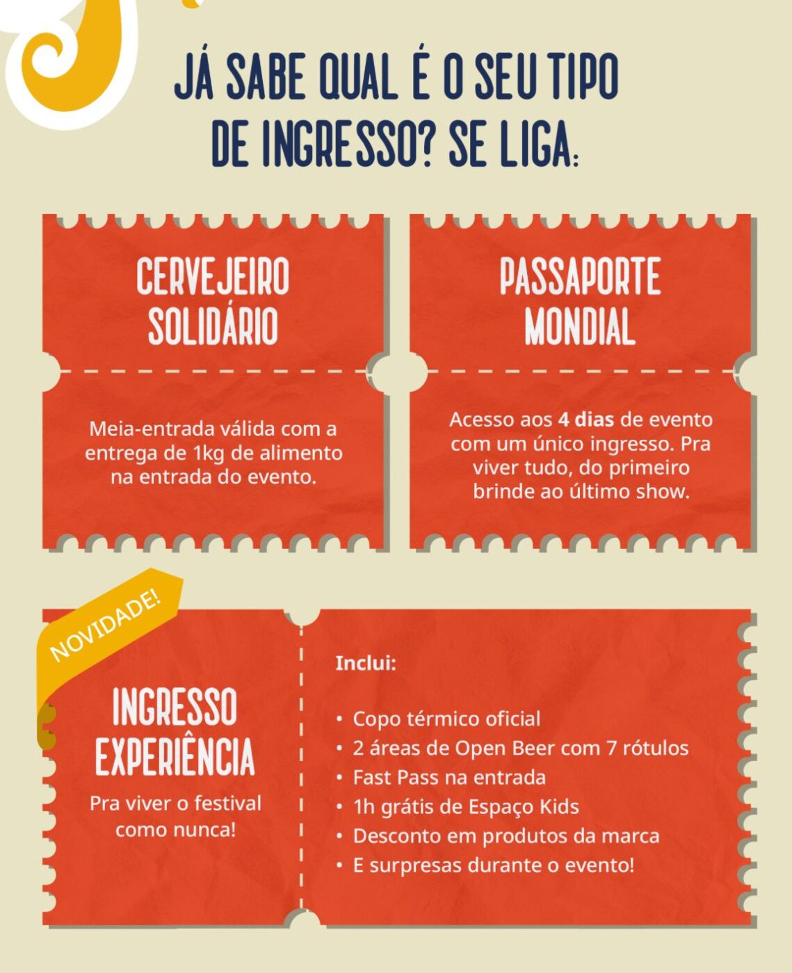 Esse ano, além dos ingressos já conhecidos: Inteira, Meia, Ingresso Solidário e o Passaporte do Mondial (dá direito aos 4 dias de evento) o organização do Mondial de la Bière criou o Ingresso Experiência, pra quem quer viver ainda mais esse evento tão amado pelos cervejeiros.